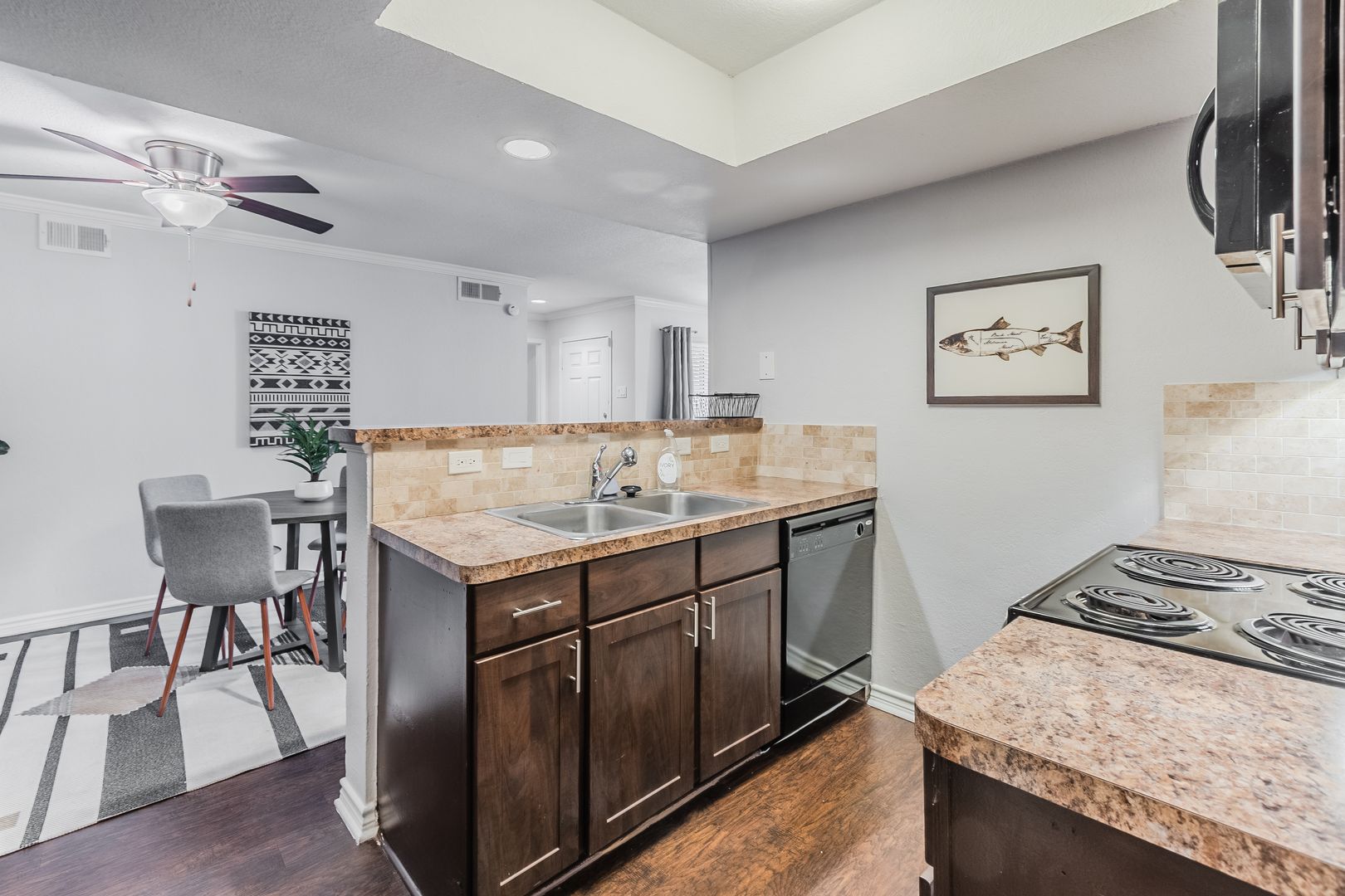 Lakeside Apartments combines modern interior finishes with a prime Dallas location for comfortable, convenient living. This newly renovated home features a stylish open kitchen with stainless steel appliances, quartz countertops, a pantry, dishwasher, microwave, and electric range; perfect for entertaining!